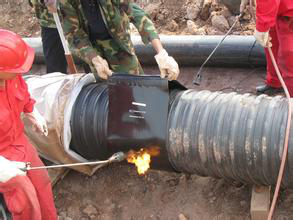 4、將熱收縮套移至接頭處居中位置,取出隔離材料。從中間沿圓周方向均勻加熱,使其完全收縮后再分別向兩端延伸加熱。加熱時(shí)熱縮套允許受熱溫度不得超過250℃,注意用火均勻。待全部收縮完后,再重新加熱表面凹凸不平的地方,使其完全平整。整體加熱完畢后,調(diào)小火焰再重新加熱一遍,以使熱熔膠充分溢出。加熱過程中用壓輥將接頭輾壓幾遍,重點(diǎn)輾壓熔合搭接處,以排除氣泡。